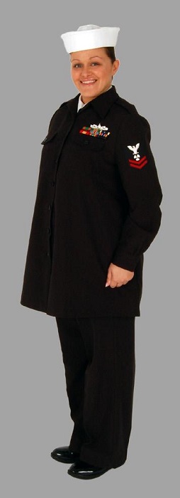 (1) Coat. A Single-breasted coat made from 100% polyester (texturized) plain weave navy blue material, with a convertible collar, seven black plastic buttons down the front. Ribbons, insignia, badges, and nametags may be worn as applicable. Officers wear removable soft shoulder boards on epaulets. Enlisted personnel wear scarlet or gold rating badges, but no service stripes.