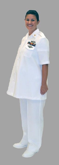 (1) Summer White maternity uniforms are authorized for wear when prescribed. The design is similar to the blue maternity skirt, slacks, and white short sleeved shirt. A vertical fabric match is required. Wear the uniform, with ribbons, unbuttoned at the collar. Officers wear hard shoulder boards, chief petty officers wear collar devices. E-6 and below personnel wear navy blue rating badge or the appropriate group rate mark.