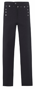 Navy blue made of 100% wool serge with 13 non-functional buttons and a hidden center-front zipper closure. Buttons are 25-line, and with black anchors. The design also includes left and right front welt pockets, one right rear pocket, laced gusset at the back, inverted side creases and flared legs (Figure 3501.92-1). Male and female trousers/slacks have gender specific sizing.